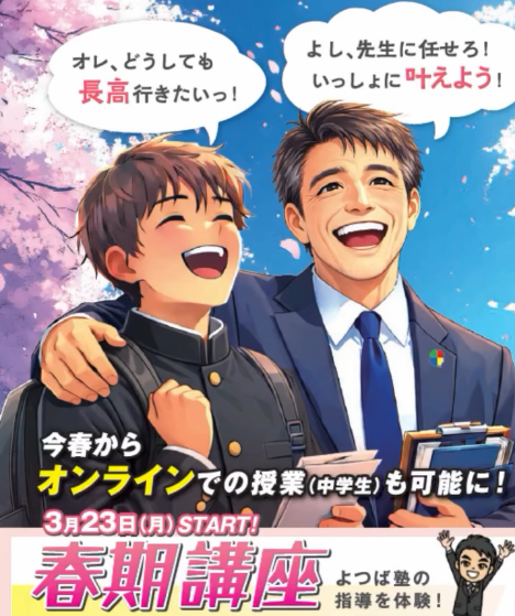 新着情報(入塾募集キャンペーンや講座情報・テスト対策など)、講師紹介、よつば塾blog