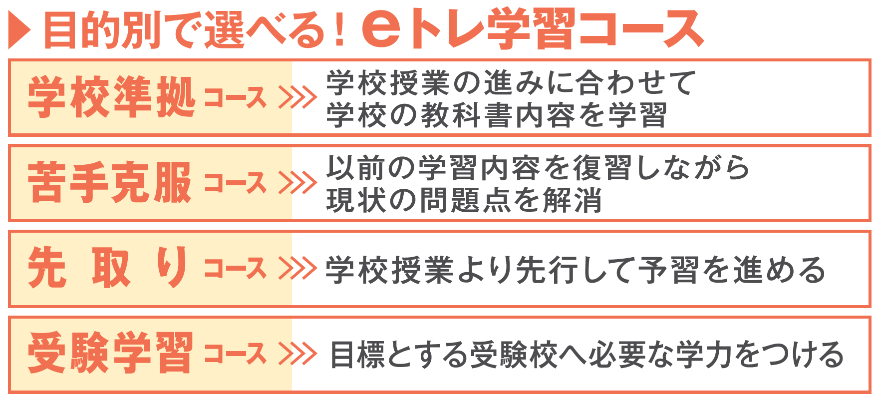 eトレは、様々な目的に対応できます。例えば、教科書内容の問題を学校に合わせて進めたり、苦手な教科・分野だけ前学年に戻って基礎から学習したりなど。さらに、難易度の高い応用問題や総合問題で、より力をつけたい人や、中学入試にもしっかり対応します。